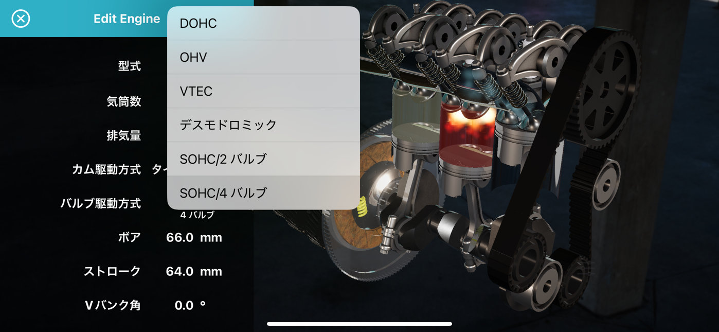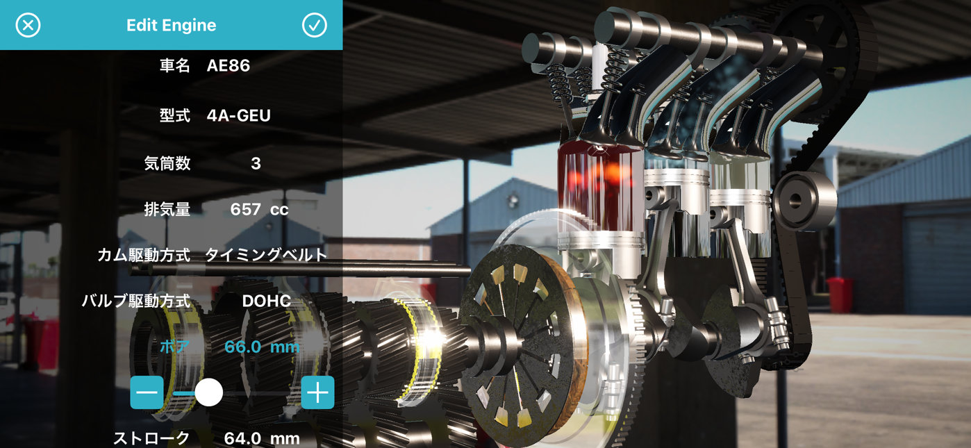 気筒数を3にして、 ボアとストロークを 66 mm × 64 mm に設定します。 これで軽自動車のエンジンになりました。