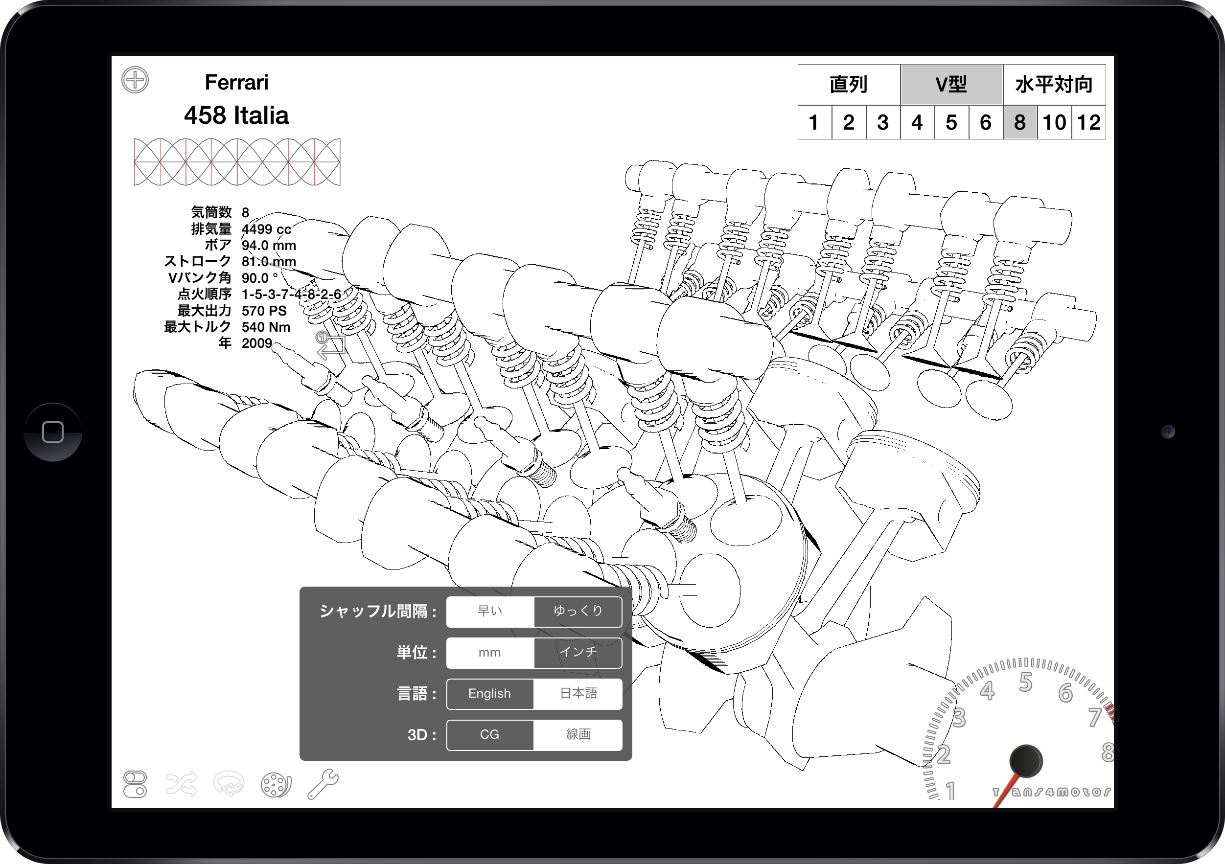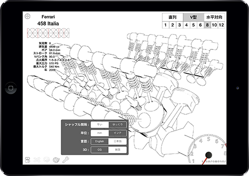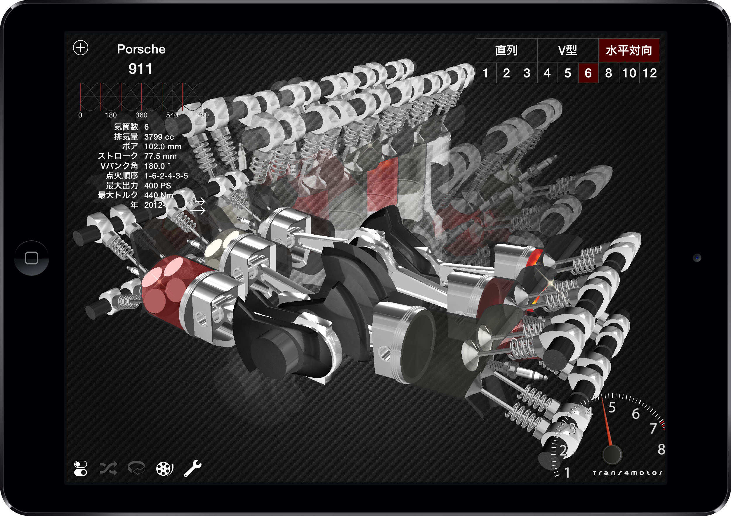 「Trans4motor」は、単気筒シングルからマルチシリンダー12気筒までの4ストロークエンジンをiPad/iPhone上で動作させることのできるエンジン・シミュレータです。