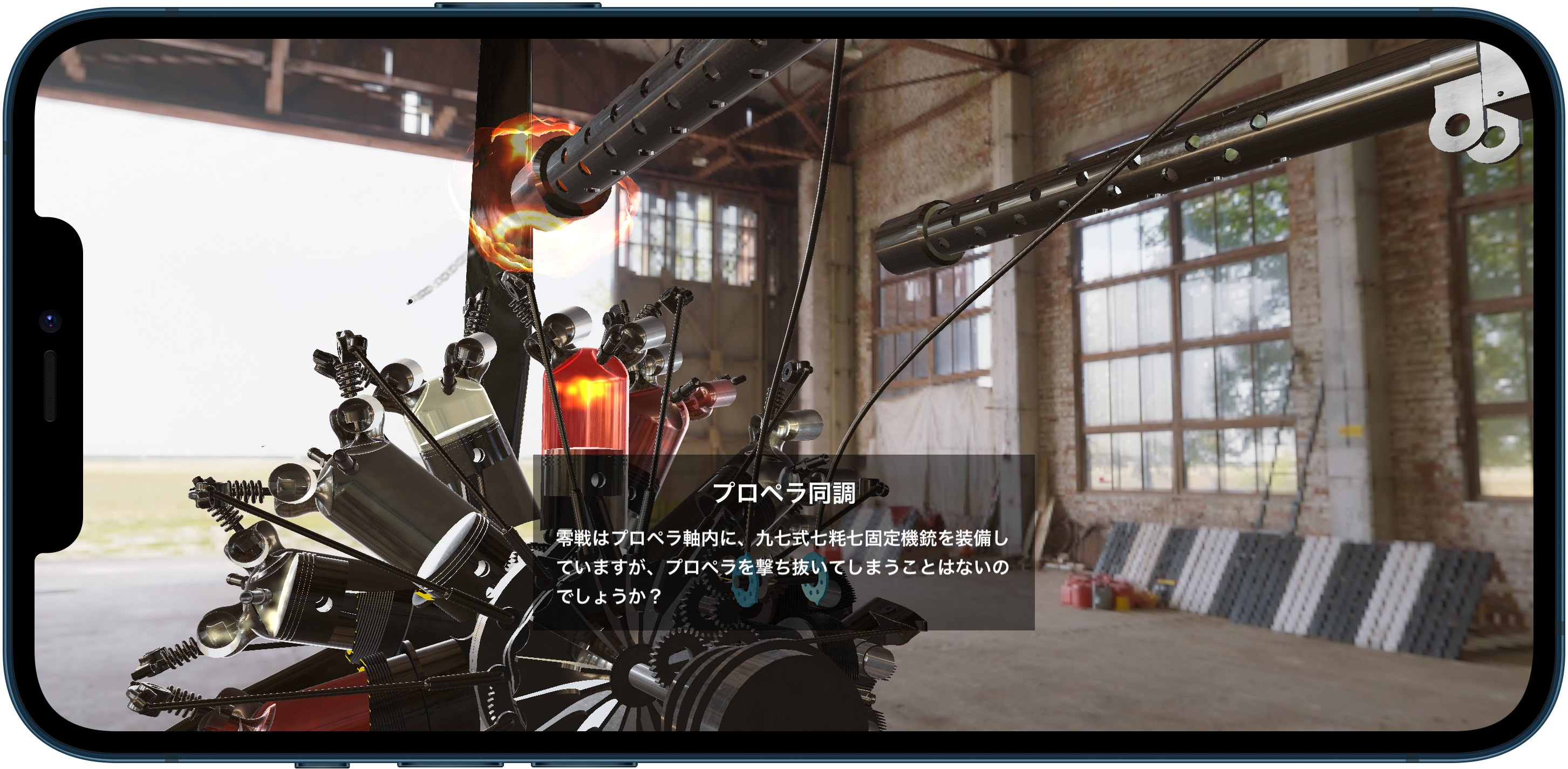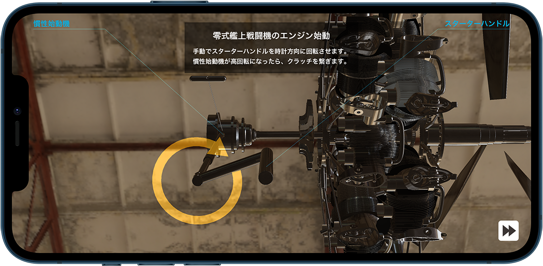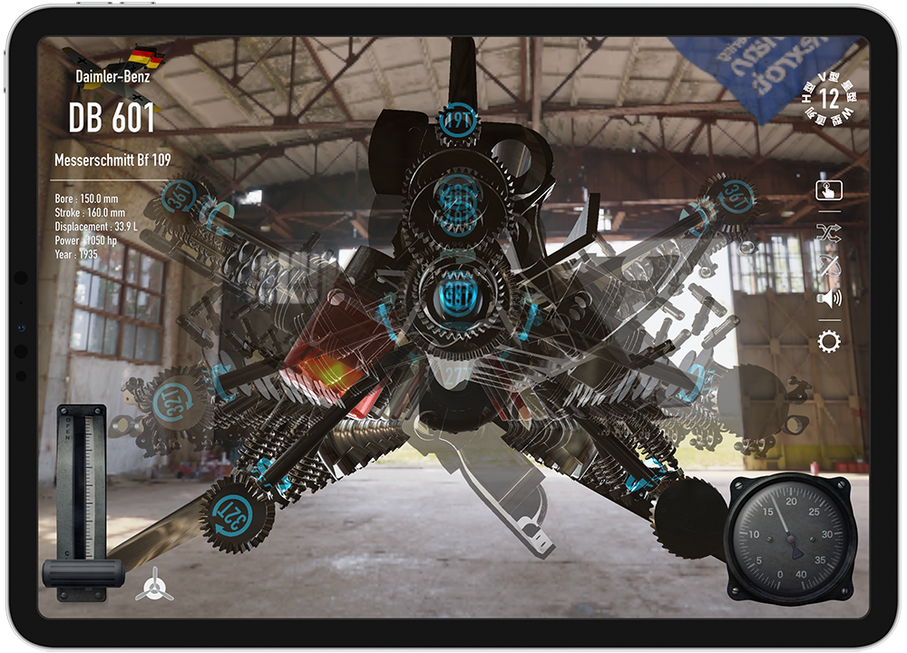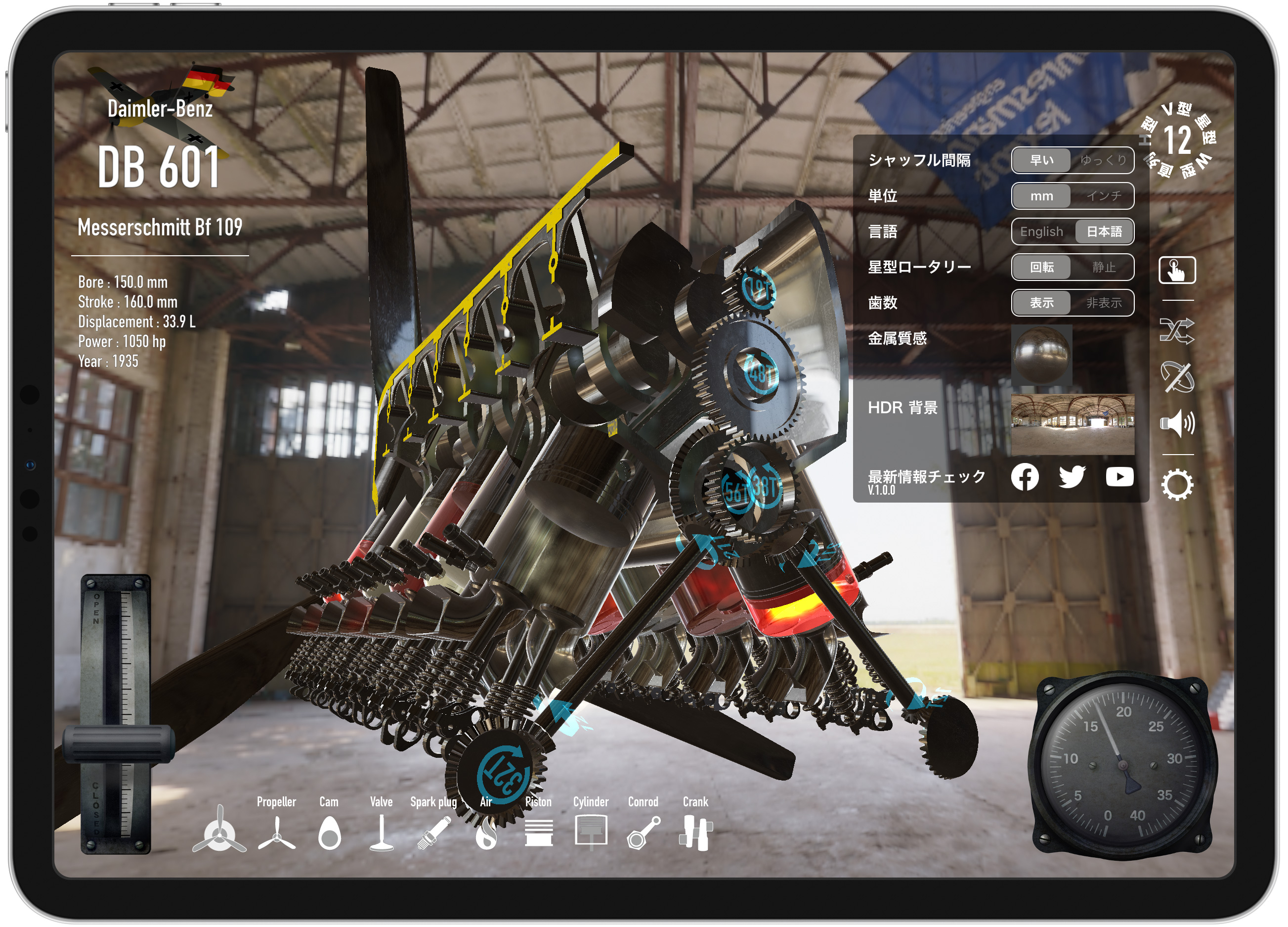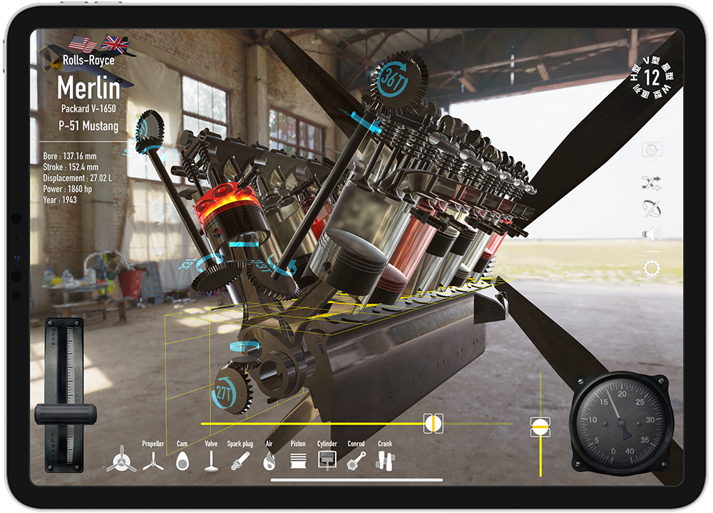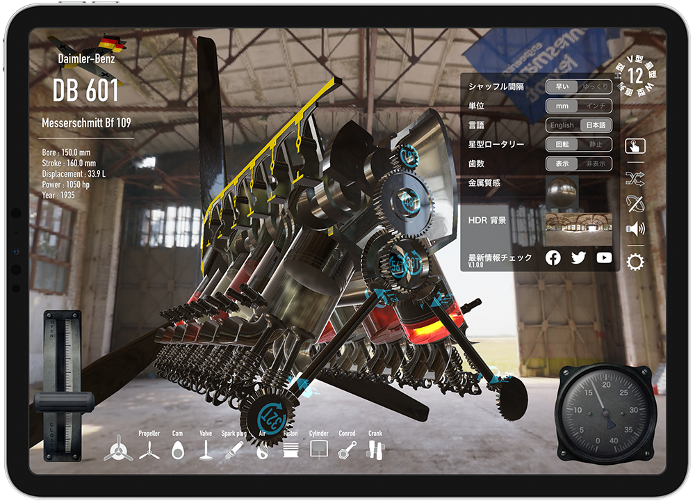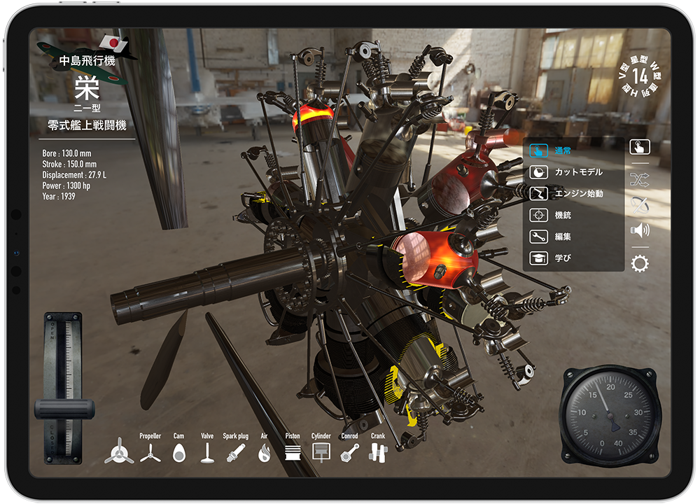 【Trans4motorの特長】 星型からV型へ、V型から倒立V型へなど、エンジンが駆動した状態で、連続的なアニメーションで変形して行きます。 ピストン、コンロッド、カムや、バルブに至るまで様々なパーツが、回転、分離、合体したりと、様々なエンジン形状への変化が楽しめます。 国際特許のエンジン音合成技術(SDL法)によるエンジン音アプリ「RealEngineSim」のサウンドデザインラボ社に再び技術協力を頂き、航空機向けエンジン音合成を新造。 気筒数の変化は、もちろん、空冷と液冷の差異や、プロペラの回転による干渉音など、リアルかつ迫力あるエンジンサウンドを再現しました。 また、本格的な航空エンジン物理モデル(エンジン発生トルクや、プロペラの直径や枚数による空気抵抗によるエンジン回転抵抗などを毎時計算)も実装しました。 空冷フィンやクランクケースを、リアルタイムで縦横自在にカットして、エンジン動作状態のまま内部を観察することができます。 スターターハンドルを手動で回して、慣性始動機の回転を上げて、クラッチをコンタクト!という一連のエンジン始動手順を、仮想体験できるモードです。 零戦搭載の栄エンジンの九七式七粍七固定機銃や、bf 109搭載のDB601エンジンのMG 151/20を試射できるモードです。 スーパースローで、プロペラ同調の仕組みも学べます。 プリセット登録の航空機エンジンは、現在、8種類。 直列4気筒から、7, 14, 18気筒の星型エンジンに、航空機特有なH型やW型、そして、V型に、倒立V型と様々なエンジンを、iPad/iPhone上で自在に再現できます。 また、ユーザー自身によるエンジンスペックの新規登録や編集機能も搭載。 エンジンのボア、ストローク、気筒数と星型の列数(3x1~9x2)、プロペラ直径や枚数などの設定が可能です。 ・4ストロークエンジンの原理 ・カムと歯車 ・航空機銃と機関砲 ・スリーブバルブ などを説明した4本の操作可能なインタラクティブ動画が収録されています。 ・パーツ毎(プロペラ/カム/バルブ/スパークプラグ/燃焼気体/ピストン/シリンダー/コンロッド/クランクシャフト)の表示/非表示機能 ・金属質感、HDR(360°背景)切替機能