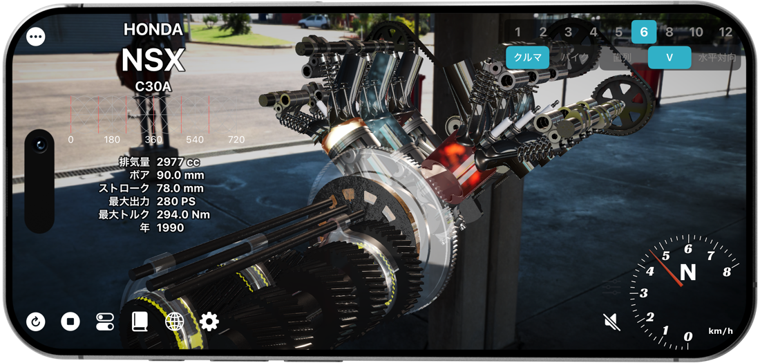 カムシャフトの分割・合体、クランク位相の変化、バルブ挟み角の動的変化まで、内部構造が生き物のように姿を変えるエンジン鑑賞体験をお楽しみください。