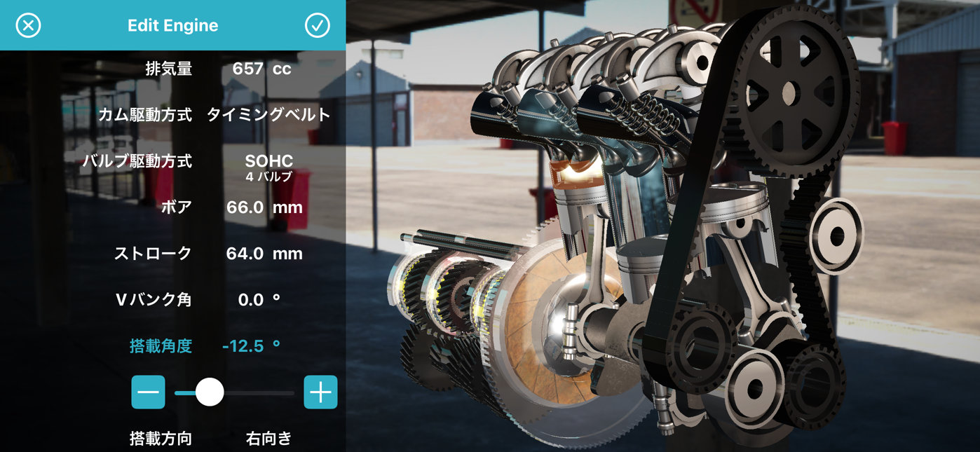 気筒数を3にして、 ボアとストロークを 66 mm × 64 mm に設定します。 これで軽自動車のエンジンになりました。