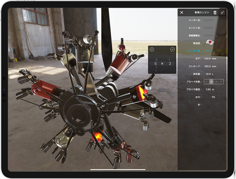 直列4気筒から、7, 14, 18気筒の星型エンジンに、航空機特有なH型やW型、そして、V型に、倒立V型と様々なエンジンを、iPad/iPhone上で自在に再現できます。